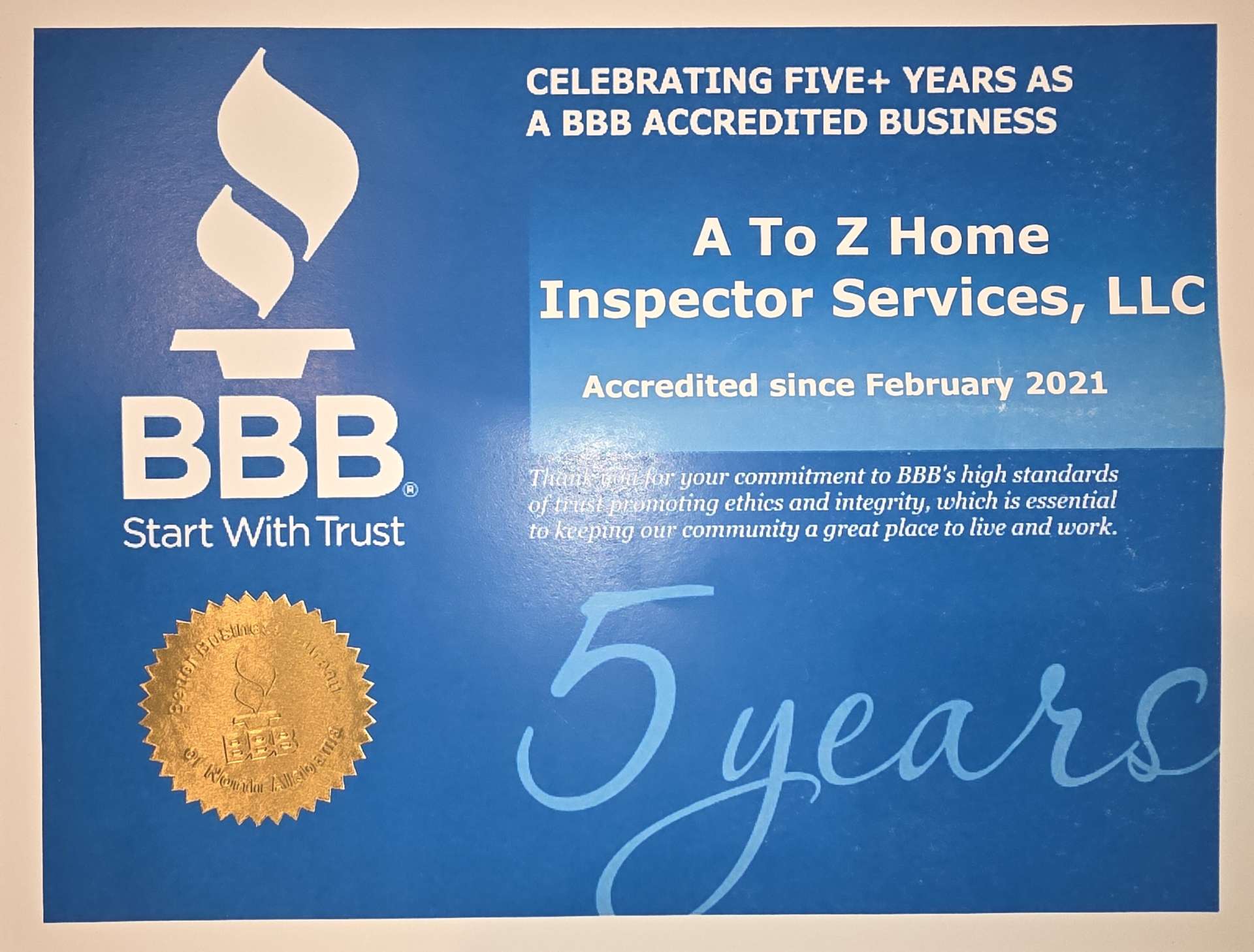 A To Z Home Inspector Services, LLC, has an A+ rating with the Better Business Bureau® and more than 100 five-star reviews
